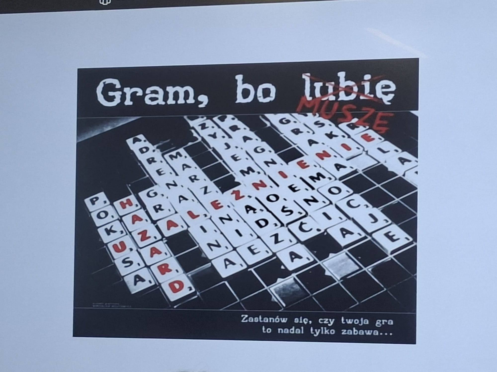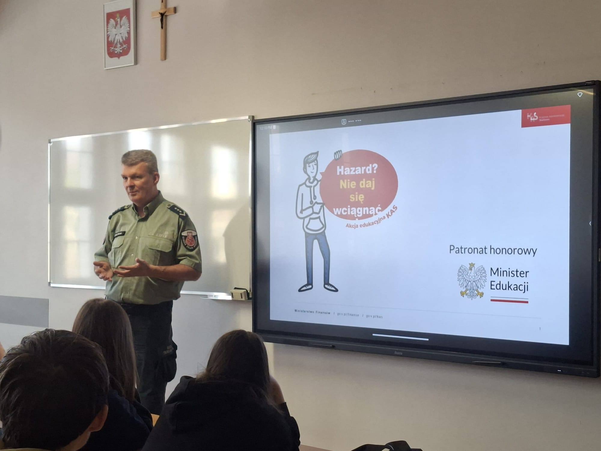 11.III.2026 r. uczniowie klas 3 i 4 uczestniczyli w warsztatach w ramach akcji edukacyjnej Krajowej Administracji Skarbowej pt. "Hazard? Nie daj się wciągnąć!". Wykład poprowadził st. asp. Jarosław Cieśliński - ekspert służby celno-skarbowej.
